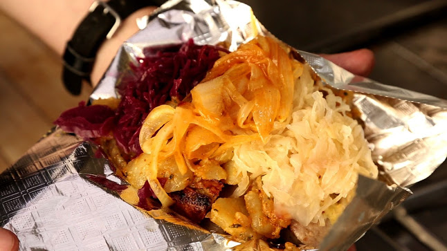 the cart is well known for its sausages which are made up of chicken, beef, pork and veal with the pickled cabbage and mustard.